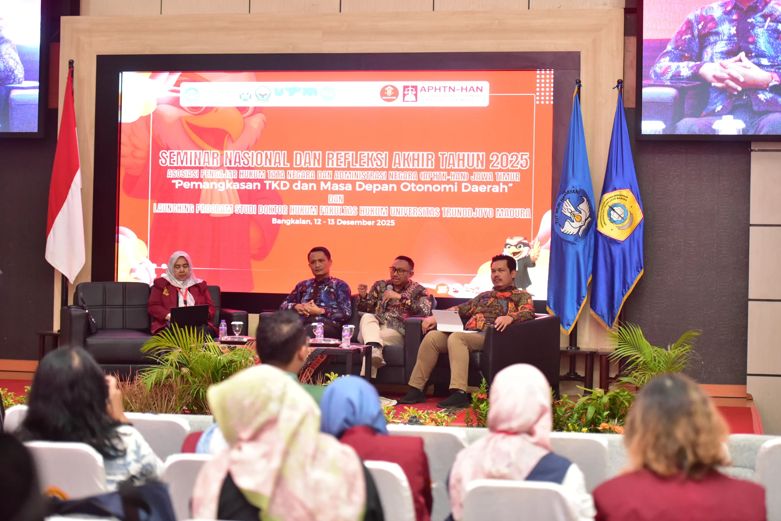 Bangkalan, 12 Desember 2025 — Universitas Trunojoyo Madura (UTM) kembali menegaskan perannya sebagai ruang akademik strategis dalam merespons isu-isu kebijakan nasional melalui penyelenggaraan Seminar Nasional Tahun 2025 Asosiasi Pengajar Hukum Administrasi Negara dan Hukum Tata Negara (APHTN-HAN) Jawa Timur bertema “Pemangkasan Transfer ke Daerah (TKD) dan Masa Depan Otonomi Daerah”. Kegiatan ini dirangkaikan dengan Launching Program Doktor Hukum Universitas Trunojoyo Madura, dan digelar di Aula Syaikhona Muhammad Kholil Lantai 10, Gedung Graha Utama, Universitas Trunojoyo Madura.