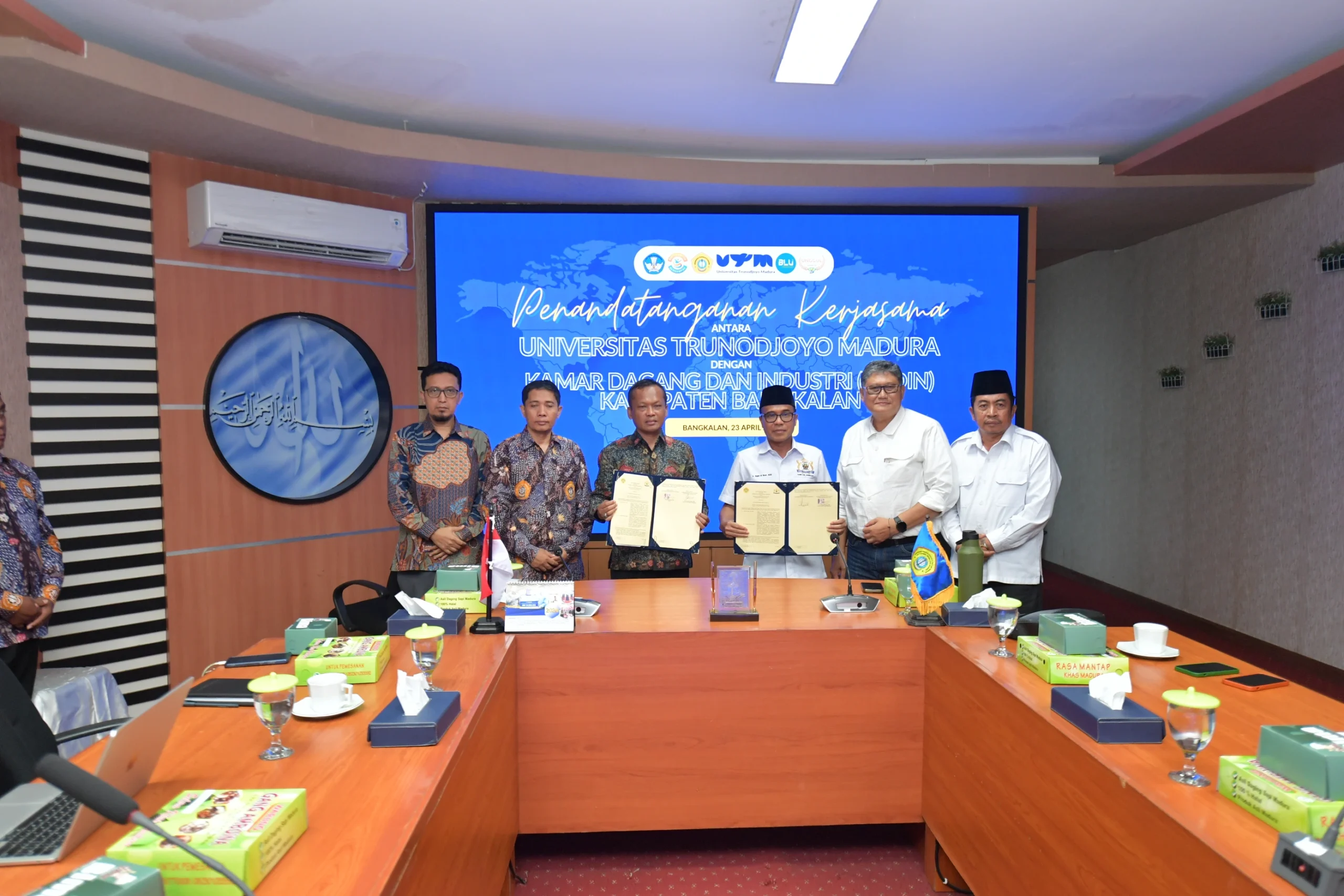 Bangkalan, 23 April 2026 — Universitas Trunodjoyo Madura (UTM) kembali menegaskan komitmennya dalam mendukung pembangunan daerah melalui penandatanganan kerja sama dengan Kamar Dagang dan Industri (KADIN) Kabupaten Bangkalan. Kegiatan yang berlangsung di Ruang Rapat 502 Lantai 5 Gedung Graha Utama ini dihadiri jajaran pimpinan universitas serta pengurus KADIN Bangkalan.