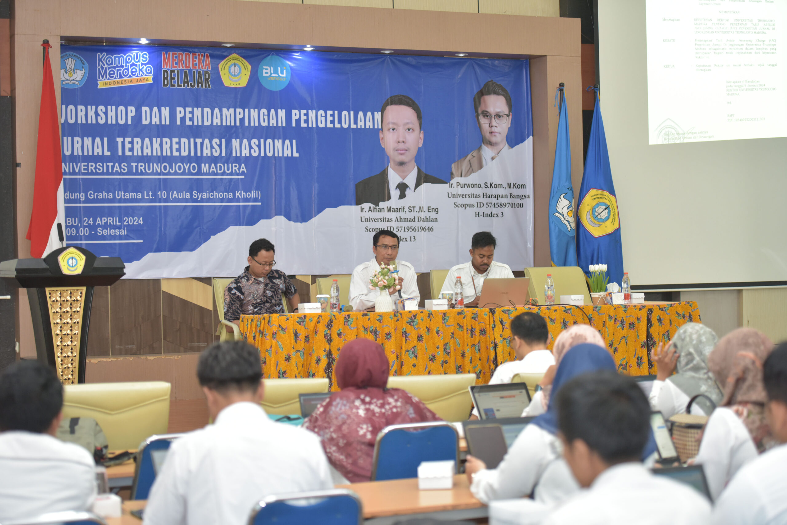 Bangkalan- Universitas Trunojoyo Madura menggelar kegiatan workshop dan pendampingan pengelolaan jurnal terakreditasi nasional di Gedung Graha Utama, pada Rabu, 24 April 2024.