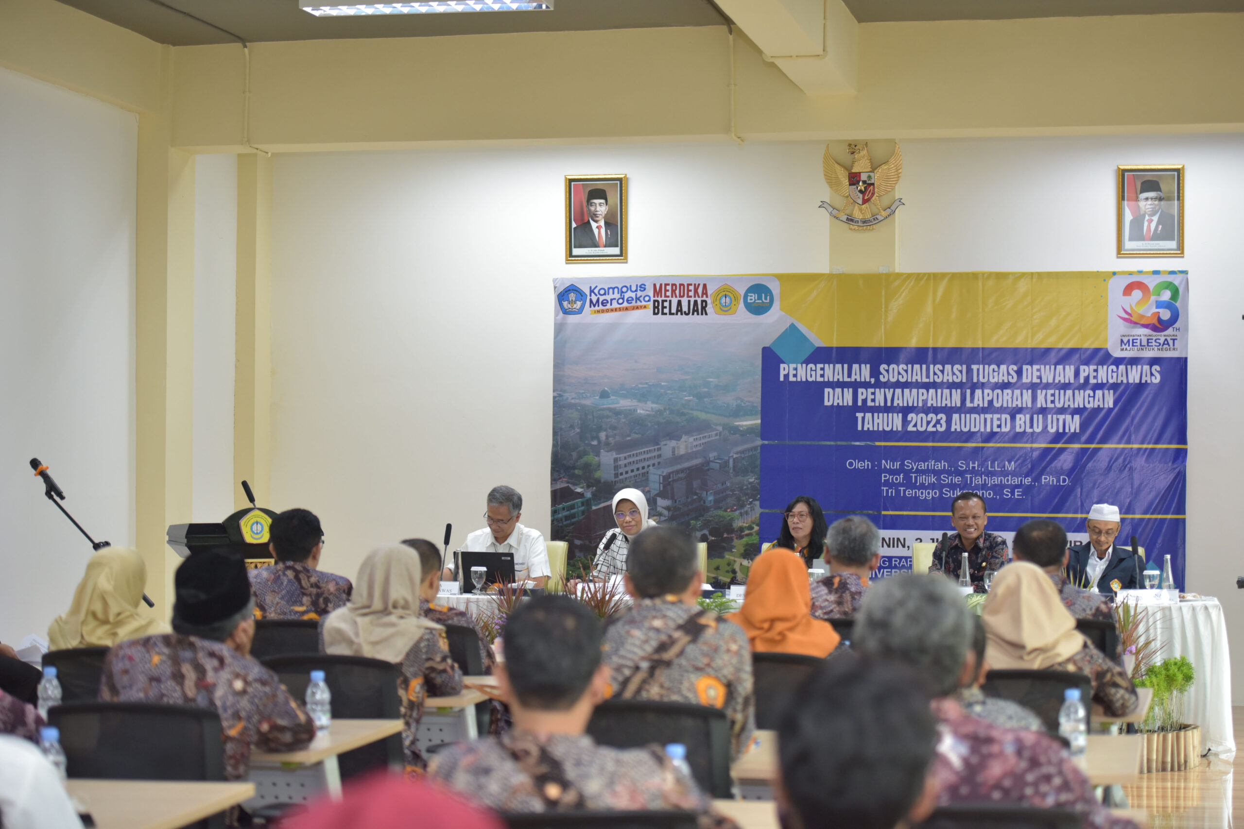 Rektor UTM, Dr. Safi’, S.H.,M.H, menyampaikan dalam sambutannya atas kehadiran Ketua Dewan Pengawas BLU UTM dan anggota Dewan Pengawas UTM.” UTM diterapkan menjadi BLU baru tahun kemarin, tepatnya pada 22 Mei 2023. Dan Dewan Pengawas BLU juga baru terbentuk pada tanggal 28 Februari 2024,” ungkap Safi’