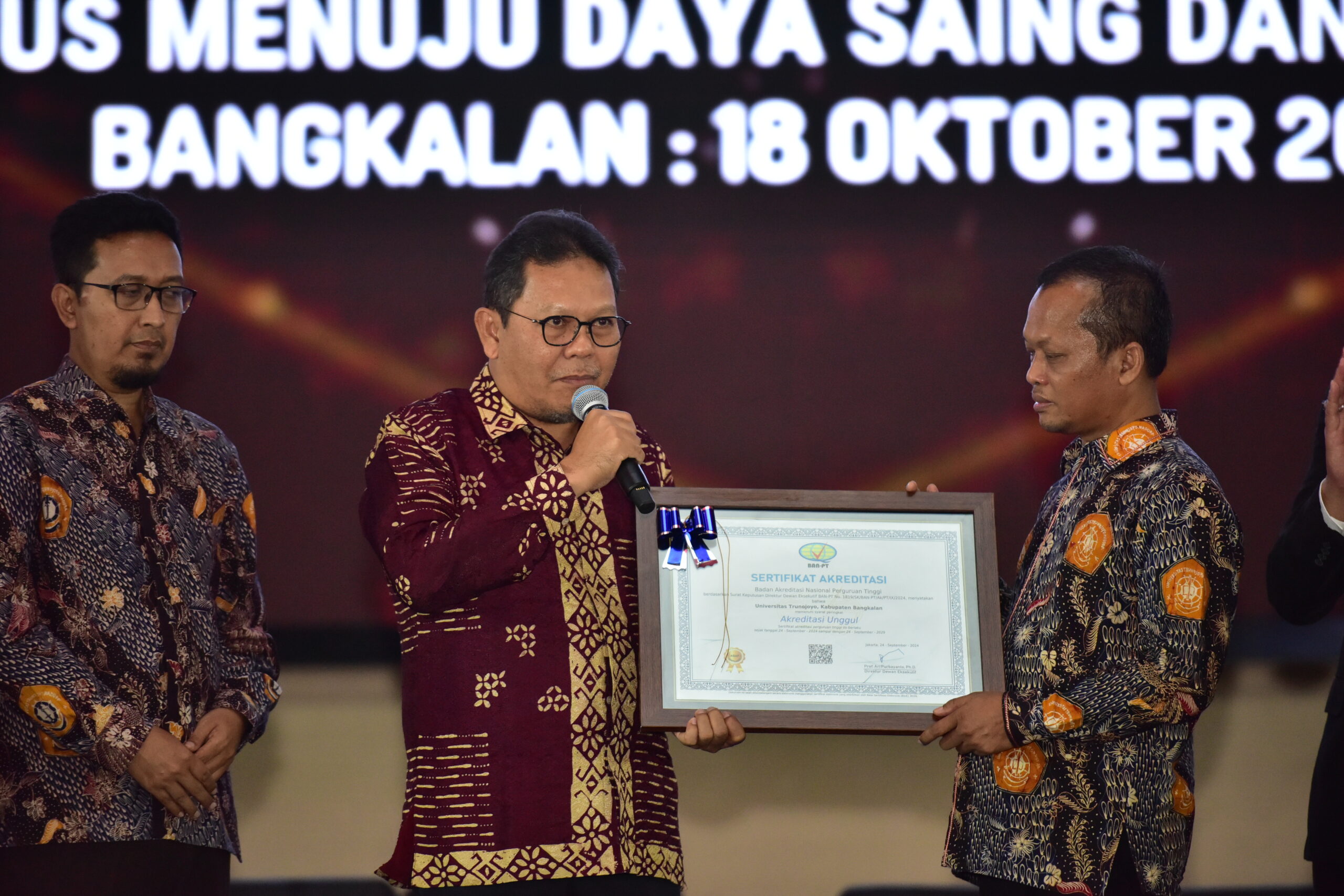 Secara simbolis, penyerahan Sertifikat Akreditasi Unggul Universitas Trunojoyo Madura dari Prof. Ari Purbayanto, Ph.D kepada Rektor UTM, Dr. Safi’, S.H. MH., didampingi Wakil Rektor Bidang Akademik; Wakil Rektor Bidang Perencanaan, Umum dan Keuangan; Wakil Rektor Bidang Kemahasiswaan, Kerjasama dan Alumni dan Ketua AIPT Universitas Trunojoyo Madura.