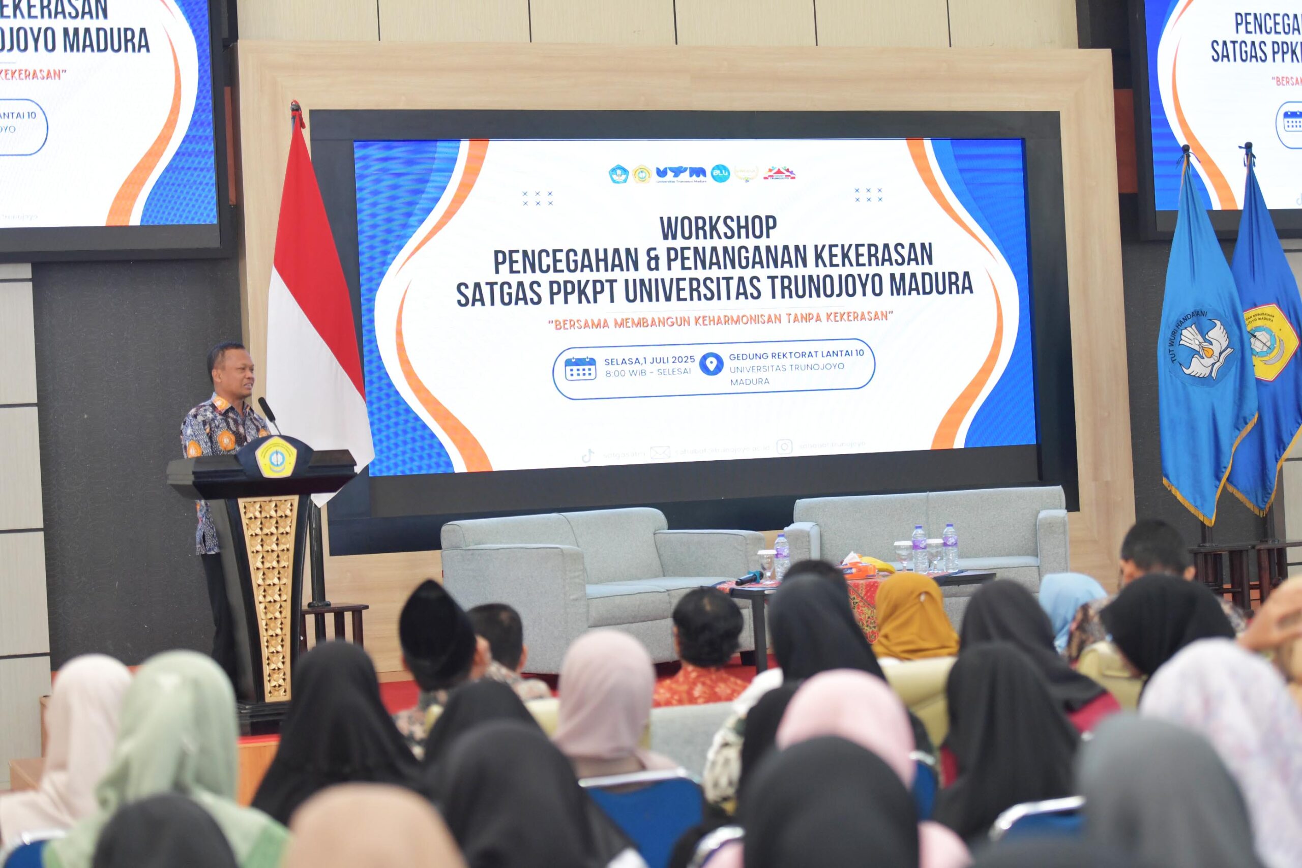 Bangkalan, 1 Juli 2025 — Universitas Trunojoyo Madura (UTM) kembali menunjukkan komitmennya dalam menciptakan lingkungan kampus yang aman, inklusif, dan bebas kekerasan. Melalui Satuan Tugas Pencegahan dan Penanganan Kekerasan di Perguruan Tinggi (PPKPT), UTM menyelenggarakan Workshop bertajuk “Bersama Membangun Keharmonisan Tanpa Kekerasan”, yang berlangsung di Aula Syaikhona Muhammad Kholil, Gedung Graha Utama Lantai 10.