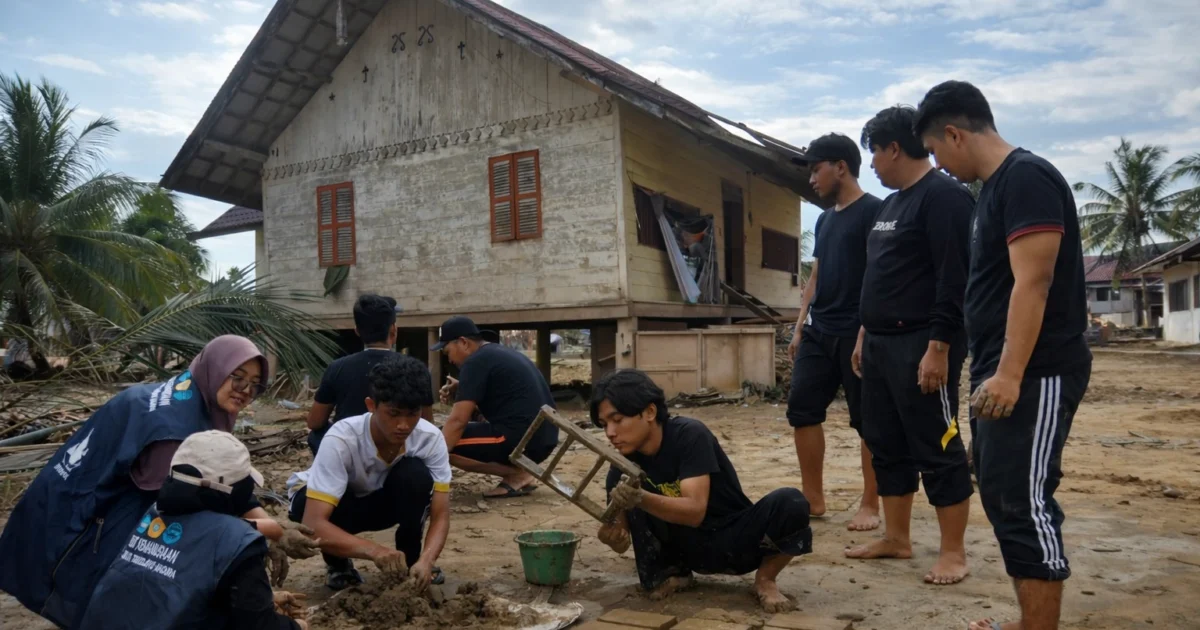 WUJUDKAN KAMPUS BERDAMPAK, TIM KKN UTM SULAP LUMPUR BANJIR ACEH UTARA JADI RIBUAN BATU BATA
