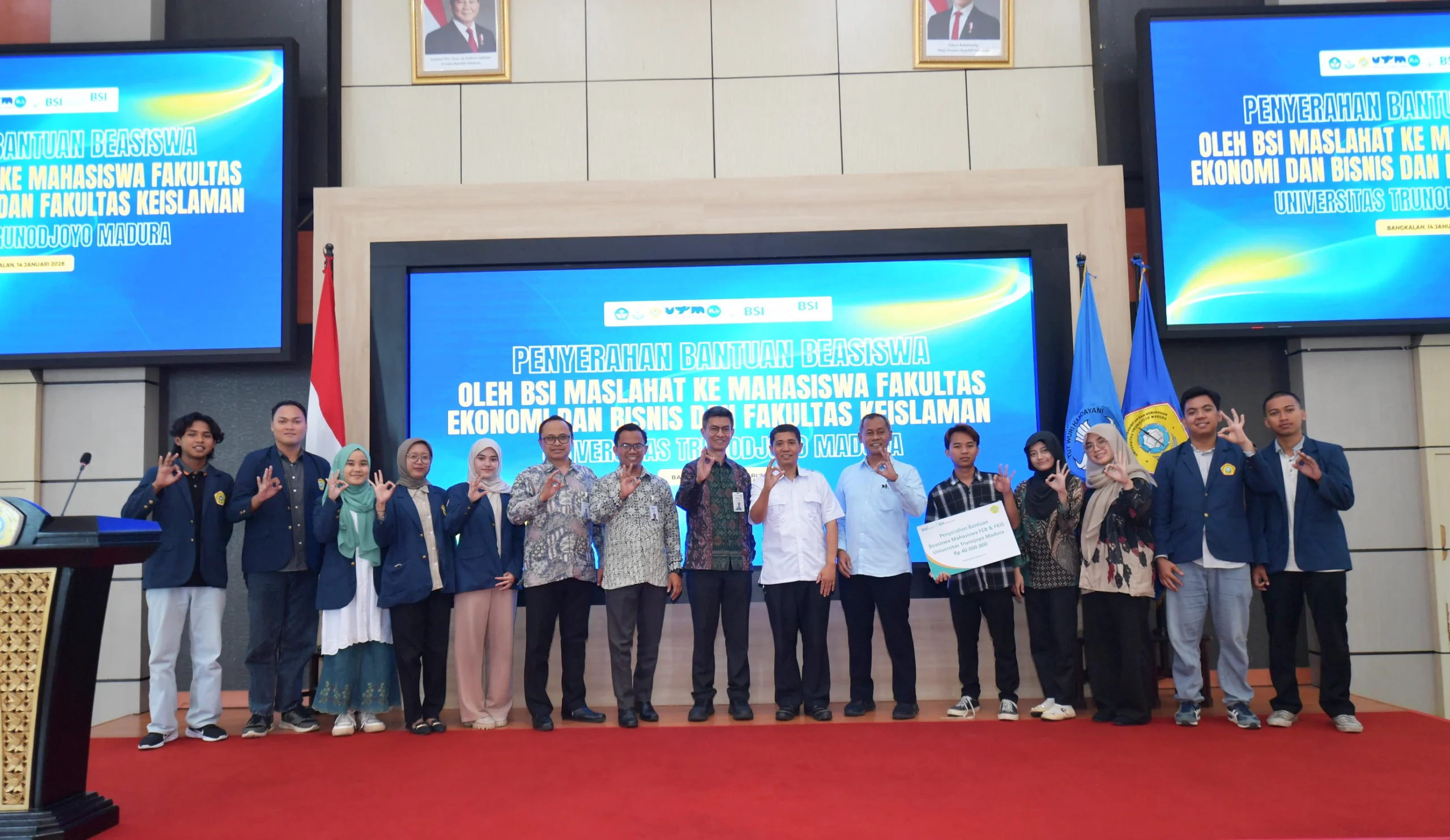 Bangkalan, 14 Januari 2026 — Bank Syariah Indonesia (BSI) melalui BSI Maslahat menyalurkan bantuan beasiswa kepada mahasiswa Fakultas Ekonomi dan Bisnis serta Fakultas Keislaman Universitas Trunodjoyo Madura (UTM) dengan total nominal sebesar Rp40.000.000. Penyerahan beasiswa dilaksanakan pada Rabu (14/1) di Aula Syaikhona Muhammad Kholil, Lantai 10, Gedung Graha Utama Universitas Trunodjoyo Madura, sebagai wujud komitmen BSI dalam mendukung akses pendidikan tinggi bagi generasi muda bangsa.